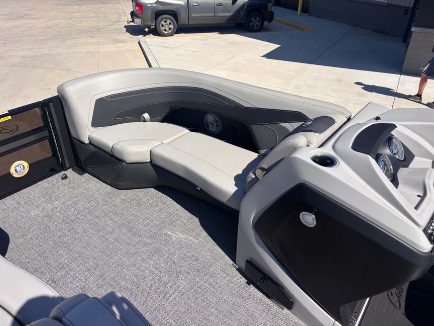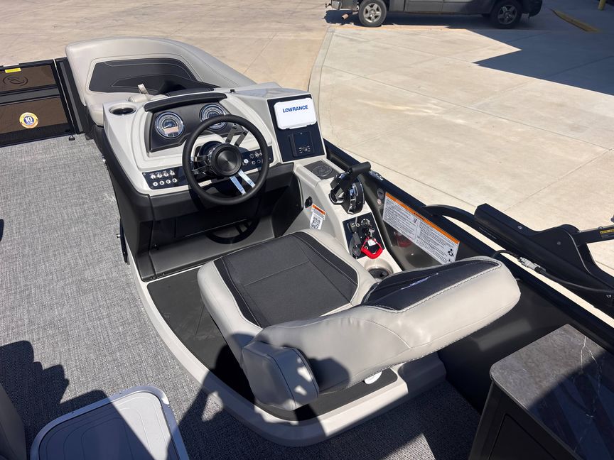 The helm features dimmable gauges, an Eagle 5 GPS, a high back, reclining helm seat with swivel and slide, an integrated cell phone storage with wireless charging station and AUX, and a raised helm platform with a marine mat.OPTIONAL FEATURES