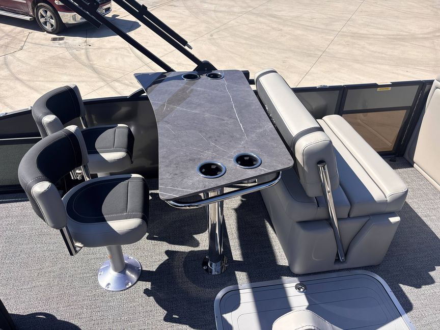 The interior is packed with comforts, including E-Z Access Integrated Waste Basket, Integrated Pet Food/Water Dishes, Stow-Away Table, and a multi-position stern lounge with USB ports and Yeti-ready cupholders.ENTERTAINMENT