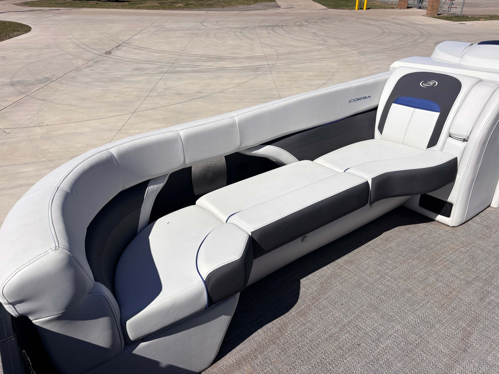 The boat features an upgraded sound system with subwoofer and amplifier, serving high-quality audio for an entertaining boating experience.
