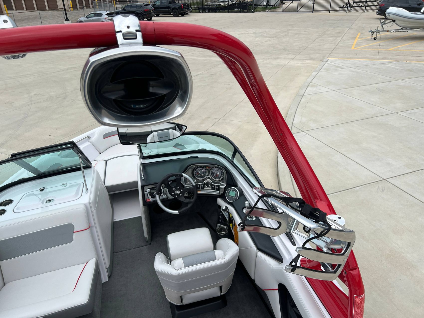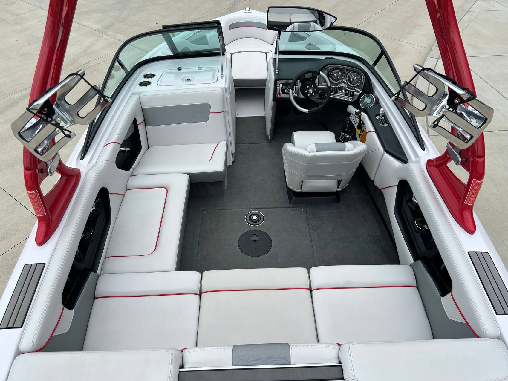 The multi-functional tower is a key highlight, accommodating tower speakers for entertainment, swivel board racks for equipment storage, and a pop-up pylon for watersports. For extra lounging flexibility, we have also included a bow filler cushion, transforming the boat's bow into a spacious sun pad.